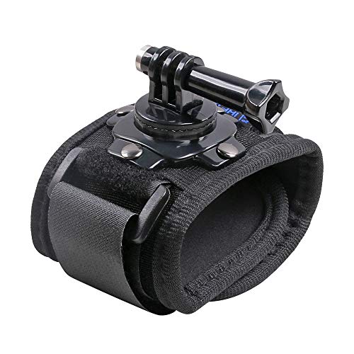 リストストラップマウントは、GoPro HeroシリーズやDJI Actionシリーズ、Insta 360 ONE R、AKASO/Camparkなどのアクションカメラに対応。360°回転アームで多角度撮影が可能。