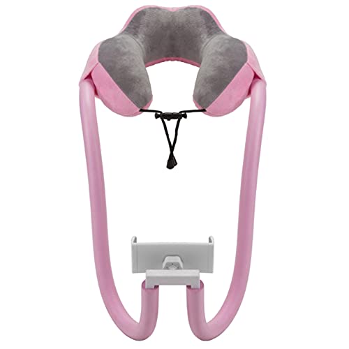 [スーツケースカンパニー]のモバイルピローは、ネックピロー、スマホスタンド、首枕として使えます。U型のクッションで調節可能、トラベルや旅行に最適。ハンズフリーでスマートフォンを楽しめるピンクのデザインです。