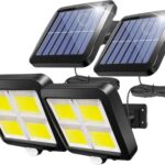 BRAVE 2個セットのソーラーライトは、分離型パネルと5Mコードを搭載し、128LEDの高輝度で屋外照明に最適。防犯や防災にも効果的で、壁掛け式で玄関や駐車場、庭に対応。