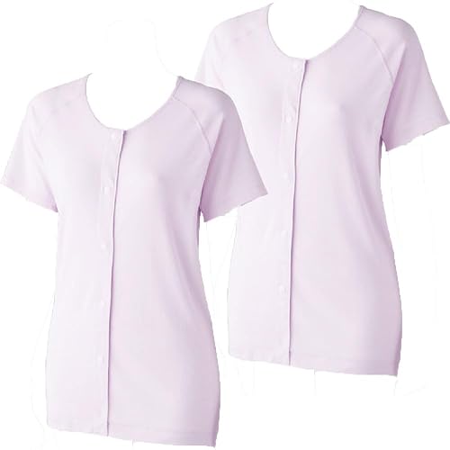 ハナサンテラスの介護下着は、女性用の前開きデザインで、2枚組、3分袖です。プラスチックホック付きで着脱が簡単。大人用の綿100%素材で快適な肌触り。カラーはラベンダー、サイズはMです。