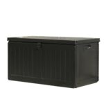 不二貿易の屋外収納庫190Lは防水タイプで鍵穴付き。収納ベンチとしても使え、サイズは幅96×奥行46×高さ49.5㎝。組立商品で黒色のデザインです。