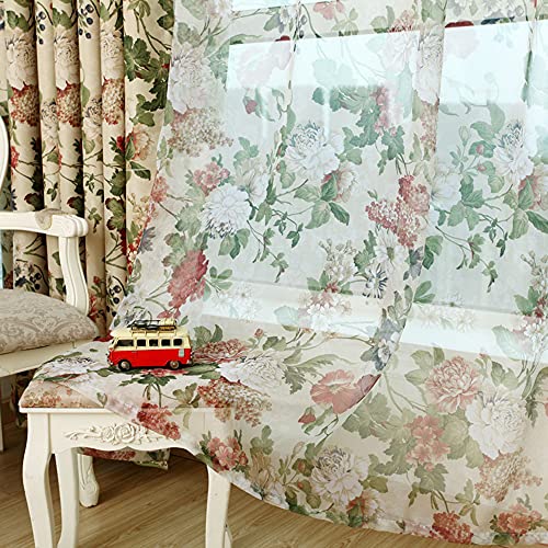 pureaqu プリントレースカーテン 赤い花柄と緑の葉の模様 自然の風を通し田舎風 薄手カーテンチュール 小窓 リビングルーム 寝室 間仕切り窓飾 取り外し簡単 1組2枚入り 幅100cm×丈178cmの高価買取