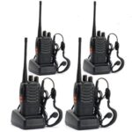 トランシーバー4台セット。2Wの超長距離タイプで、1500mAHの充電式リチウムイオンバッテリーを搭載。簡単操作で、充電器、イヤホンマイク、ベルトクリップ付属。総務省技術基準適合商品、日本語説明書付き。
