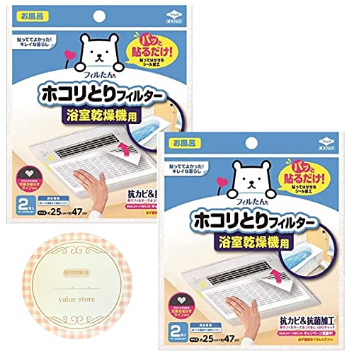 東洋アルミのホコリとりフィルターは、浴室乾燥機用の2枚セット。サイズは約25cm x 約47cm。簡単に貼るだけで効果的にほこりをキャッチ。おまけとしてオリジナルシール付き。