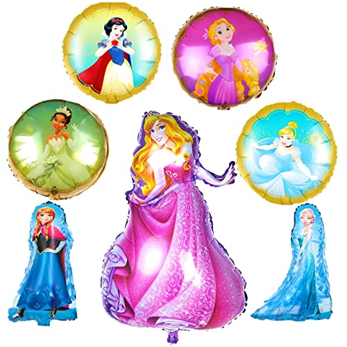 ディズニープリンセスの丸型バルーン7点パック。ベル、ラプンツェル、白雪姫、シンデレラ、オーロラ、ジャスミンのデザイン。お誕生日やお祝いにぴったりの風船セットです。