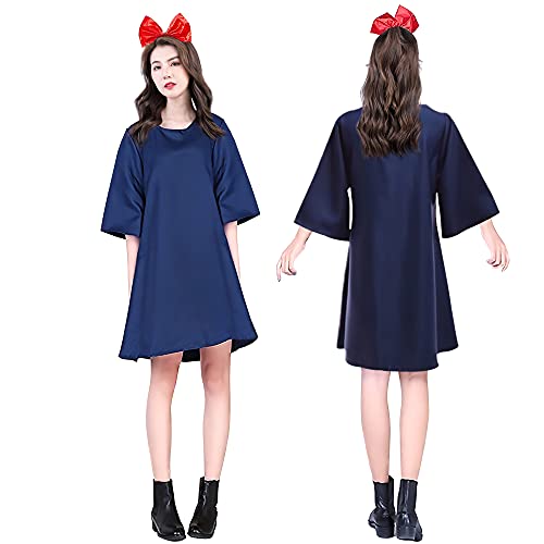 ハロウィンコスプレに最適な魔女の宅急便キキの仮装セット。大人用ワンピースとカチューシャ付き。レディース向け、フリーサイズ。ネイビーで、パーティーやイベントにぴったり。
