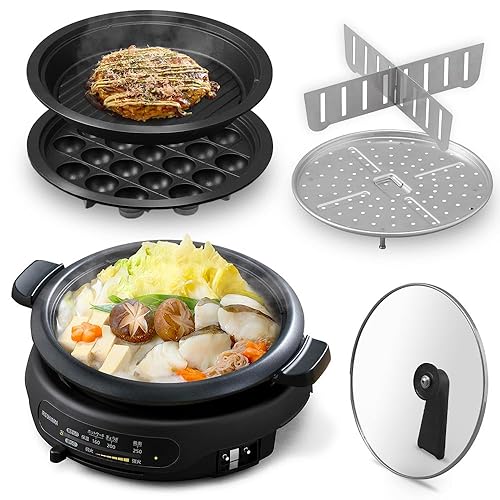 アイリスオーヤマのホットプレートIGU-B3-Bは、深鍋と焼肉、たこ焼きプレートの3枚付属。高火力1300Wで保温機能付き、250℃まで加熱可能。2~4人用、保証付き。
