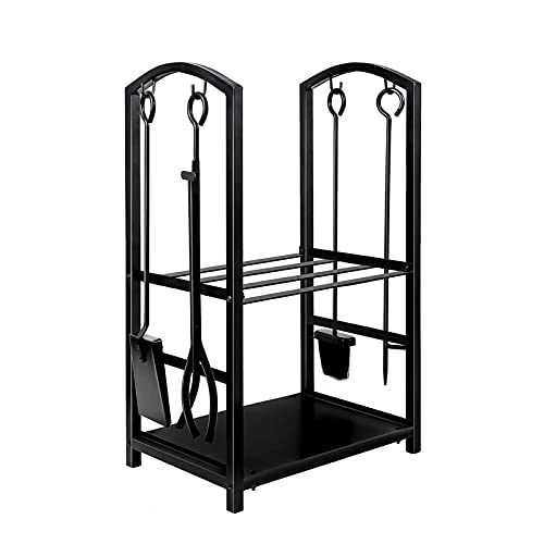 錬鉄製の木製ホルダーと薪収納ラックがセットになった暖炉用品。4つのツール付きで、頑丈なデザイン。サイズは45x30x75cmで耐久性も抜群です。