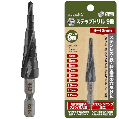 ネセクトのステップドリル6.35mmは、精密な穴あけが可能で、異なるサイズの孔を一度の作業で開けられます。耐久性に優れた素材で作られており、金属やプラスチックに対応します。