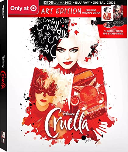 『クルエラ』ターゲット限定アートエディション4K Ultra HD + Blu-ray + 2つのホイルエッチングプリントがセットになった特別版。高画質で映画を楽しむとともに、アートプリントも手に入る魅力的なパッケージです。