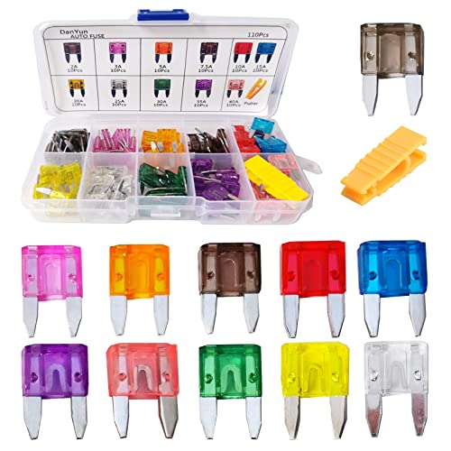 DanYunの110個ミニ平型ヒューズセットは、2Aから40Aまで各10個を含み、ヒューズ脱着工具付き。車、トラック、オートバイ用の電装必需品です。