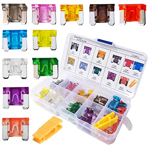 DanYunの110個低背ヒューズセット。ミニ平型ヒューズ(2A〜40A)各10個、ヒューズ脱着工具付き。車・トラック・オートバイの電装必需品。