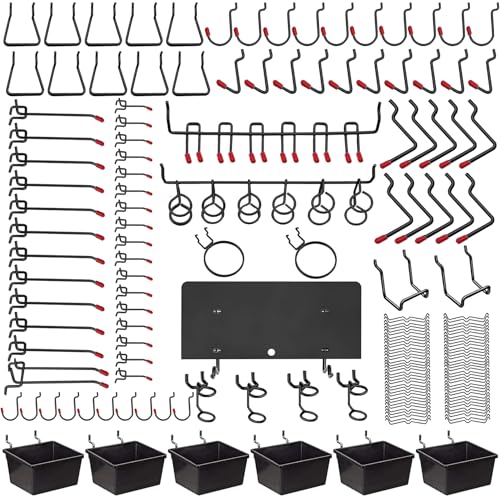 156個の有孔ボードフックです。厚さ1-6mmのボード対応、穴ピッチ25mm。スチール製で、壁面収納や商品展示に最適です。プラボックス付きで使いやすい。