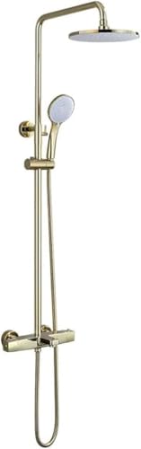 サーモスタティックゴールドラグジュアリーシャワータップセット。ブラス製のダイバートミキサー、10インチの降雨シャワーヘッド、ハンドシャワーを含む壁掛けシャワーセット。