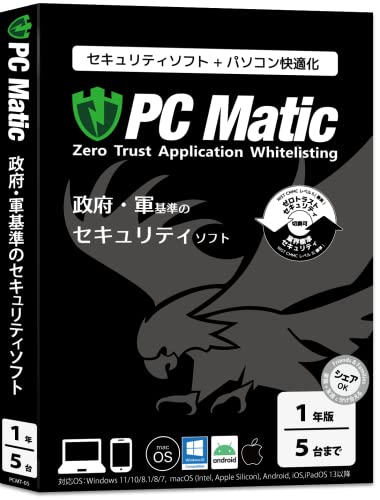 PC Maticは、政府・軍基準のセキュリティソフトで、1年ライセンスで5台対応。Windows 11~7、macOS、Android、iOSに対応し、高度な保護機能を提供します。