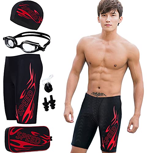 男性用の競泳用水着セット。速乾性素材で快適に泳げる。5点セットにはスイミングゴーグル、スイムキャップ、ノーズクリップ、耳栓が含まれ、メンズの水泳やジムに最適。サイズはL。