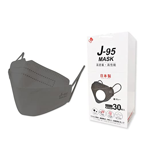 J-95MASKは、クラス3に適合した医療用マスク。30枚入りで個別包装、日本製の4層不織布仕様。3D立体フィットデザインで、カジュアルやスーツにもマッチするグレーの無地マスクです。