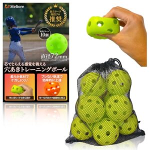 Meliore 野球 穴あきボール バッティング練習 【現役プロ推奨】 柔らかい 72mm 軟式 バッティング 練習 トレーニング 子供 大人 収納袋付き 蛍光グリーン 10個
