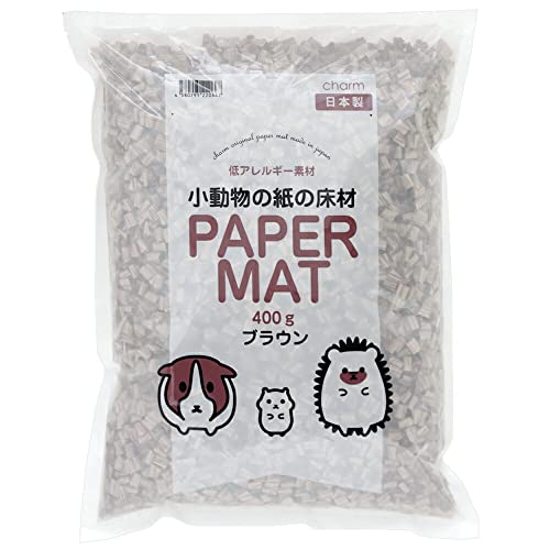 国産小動物用紙の床材、ブラウン色で400gの容量。ハムスター、モルモット、ハリネズミに最適な低アレルギー素材を使用。快適な環境を提供し、吸収性にも優れています。