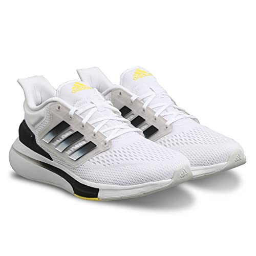 アディダスのランニングシューズEQ21は、ユニセックス対応でフットウェアホワイト、コアブラック、ビームイエローのカラーリング。サイズは25.5 cm。軽量でクッション性に優れ、快適なランニング体験を提供します。