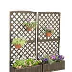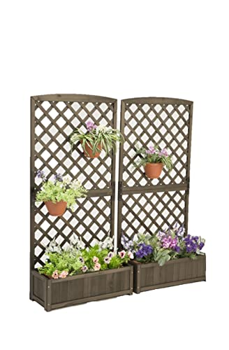 リビングアウトの木製プランターラティスは、ダークブラウンで幅71.5cm、奥行30cm、高さ148cm。天然木を使用し、ガーデニングや壁面緑化、目隠しに最適。鮮やかな色の植物を引き立てます。