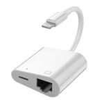 Apple MFi認証の2イン1 Lightning~イーサネット用アダプター。RJ45ポートで100Mbpsのイーサネット接続が可能。充電ポート付きでiPhone/iPad/iPodに対応。