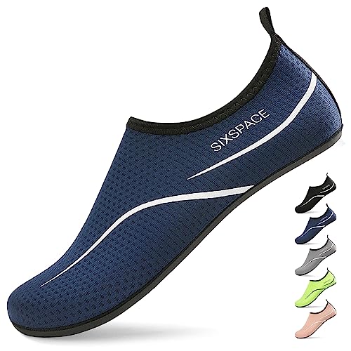 男女兼用のマリンシューズ。軽量で通気性抜群、滑り止め機能もあり、ウォーターアクティビティやフィットネスに最適。ネイビーでオシャレなデザイン。サイズは26.5cm。