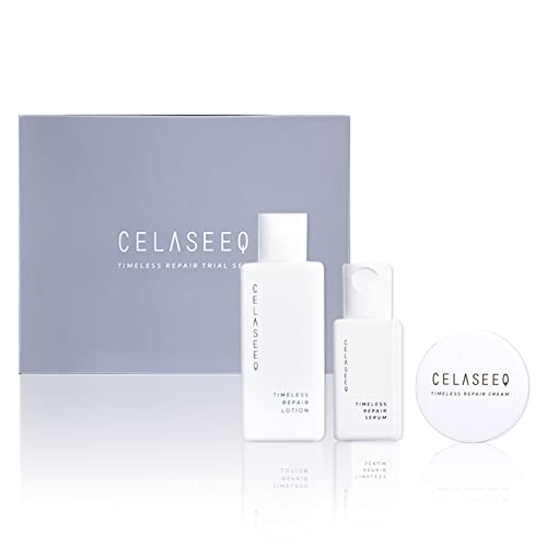 CELASEEQ(セラシーク)タイムレスリペアお試しセットは、ヒト幹細胞を使用した化粧水、美容液、クリームが含まれるトライアルセット。高保湿で肌の再生をサポートするスキンケア商品です。
