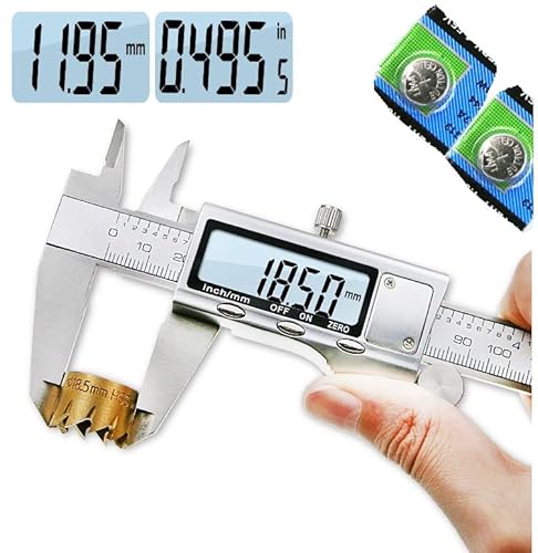 150mmのステンレス鋼製デジタルノギス。全金属製で高精度。防水設計で内径、外径、深さ、段差測定が可能。LCDディスプレーで大文字表示、ゼロリセット機能付き。電池と収納ケース付き、コンパクトなデザイン。