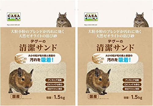 マルカンの底砂 CASA デグーの清潔サンドは、1.5kg×2袋セットで提供され、パン型シリコン輪ゴムまたはオリジナルコースターが付属しています。国産で安全性が高く、デグーにやさしい環境を提供します。