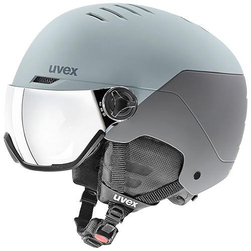 uvex(ウベックス)のスキースノーボード用バイザーヘルメット。眼鏡対応で、ダイヤル式サイズ調整機能付き。サイズは58-61 cm。安全性と快適性を兼ね備えた設計。