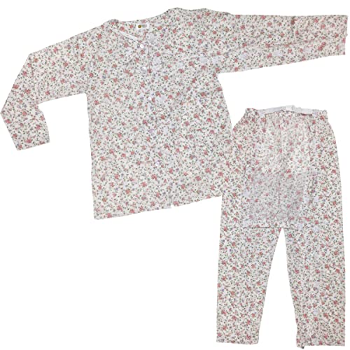 ハナサンテラスの介護用パジャマは、マジックテープで全開・フルオープンが可能。女性向けで、オムツ交換が容易な両脇全開仕様。長袖デザインで、寝たきりの方にも最適。カラーはピンク、サイズはLです。