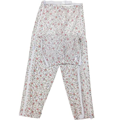 ハナサンテラスの介護用パジャマは、両脇全開のファスナー付きパンツです。婦人用、オムツ交換がスムーズに行える設計。色はピンクで、サイズはSです。