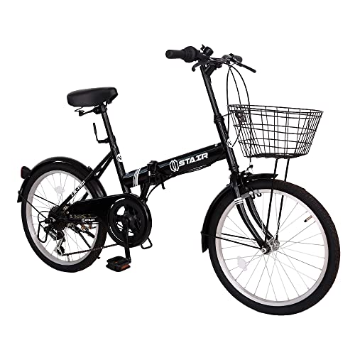 折りたたみ自転車 20インチ、シマノ6段変速。カゴ、ワイヤ錠、ライト付き。前後泥除け装備、ハンドル高さ調節可能。小径車のミニベロ、カラーはブラック。
