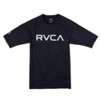 RVCAの半袖ラッシュガード、UVカット機能付きで、マリンスポーツやアウトドアに最適。キーループ付きで、動きやすくデザイン性も高い。型番BC041-807、カラーはブラック(XL)。