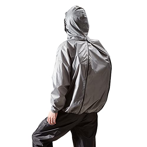 THE ROOTSのレインスーツはリュック対応の上下セット。透湿防水生地を使用し、梅雨や通勤、通学、自転車に最適。収納袋付きで持ち運びも便利。シンプルなデザインでアウトドアにもぴったり。カラーはダークグレー、サイズはLL。