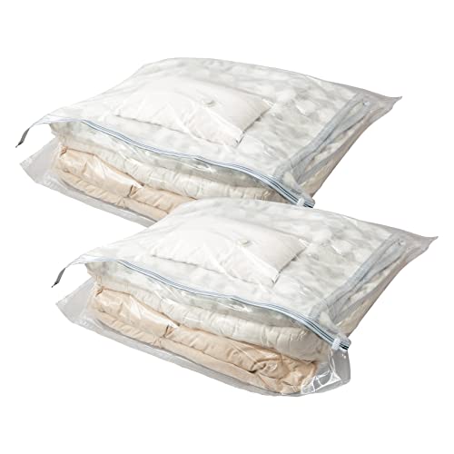 コモライフのマチ付ふとん用圧縮袋は、ダブル布団1枚、毛布1枚、枕1個を収納可能。サイズは約縦100×横120×マチ44cmで、掃除機または手押しで圧縮。破れにくく、色付きファスナーで開閉も簡単です。