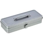 TRUSCOのトランク型工具箱T-32SVは、サイズ333x137x68mmで、シルバーのカラーが特徴です。頑丈な作りで、工具や小物を整理・収納するのに最適なアイテムです。