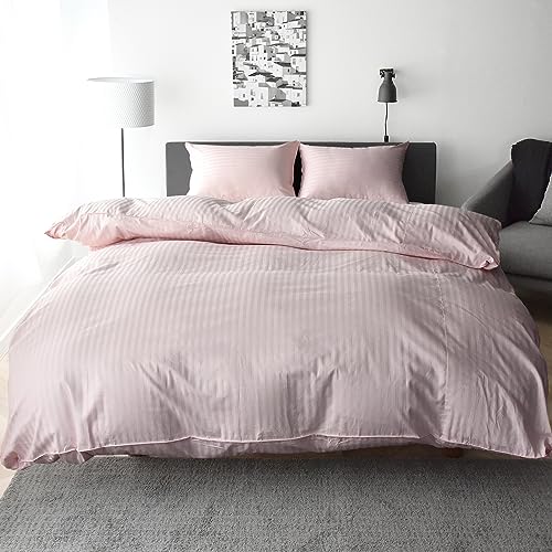 Sleep Tailorの日本製布団カバーセットは、クイーンサイズ4点で、防ダニ機能付き。綿100%の高密度生地315本を使用し、サテンストライプのデザインが特徴。掛け布団カバー、ボックスシーツ、枕カバー2枚が含まれ、北欧風なおしゃれな仕上がり。カラーはベビーピンク。