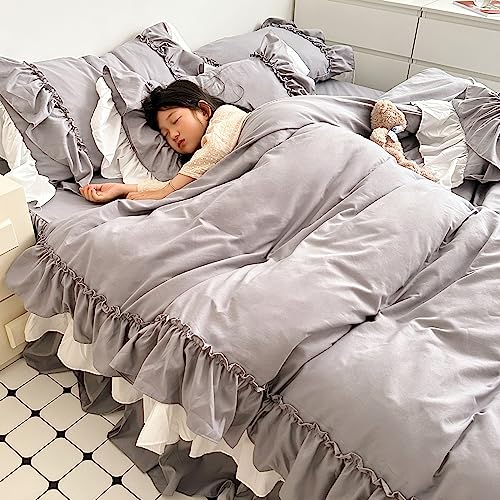 フリル付き布団カバー3点セット(セミダブル、グレー*フリル3層)は、洋式・和式兼用で、掛け布団カバー、ボックスシーツ、枕カバーが含まれています。肌に優しいピーチスキン加工で、北欧風デザイン。四季通用の寝具カバーです。