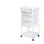 キャスター付きベビー用品収納ラック。3/4段構成で多機能。オムツや小物収納に便利な引き出し付き。移動も簡単な取っ手付き。キッチンワゴンとしても使え、おしゃれなデザイン。カラーはホワイト、全3色。