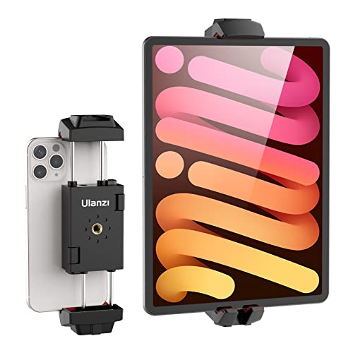 Ulanziタブレットホルダーは、2.55-12.9インチ対応で、iPad、Galaxy、Surface Goおよびすべてのスマートフォンに対応。コールドシュー付き、1/4ネジ穴で三脚に取り付け可能。