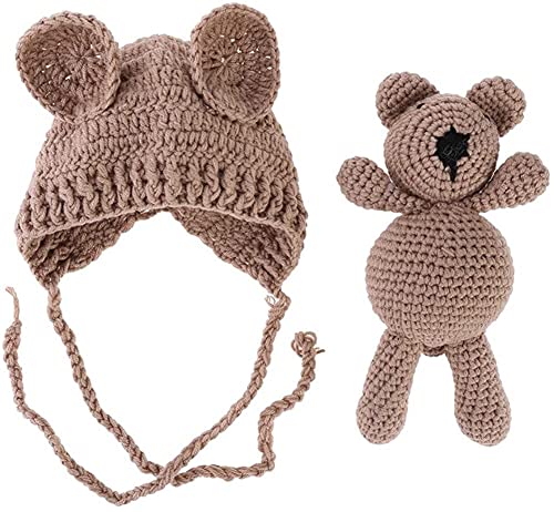 暖かい赤ちゃん用の単色かぎ針編み帽子。幼児用のクマデザインで、スタジオ撮影に最適。サイズはライトブラウンで0-1ヶ月対応です。