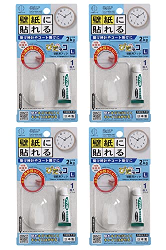 小久保工業所のぴたッコ壁紙用フック(Lサイズ/1個入り×4個セット)は、耐荷重2kgで半透明のはがせる接着剤を使用。小物かけや壁掛けに最適な日本製粘着フックです。