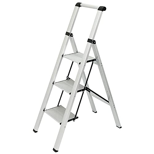 ONE STEP スタイリッシュ脚立は、アルミ製の薄型踏み台で、折りたたみ可能。軽量でおしゃれなデザイン。手すり付きの3段タイプで安全性も◎。収納や持ち運びに便利なステップラダーです。