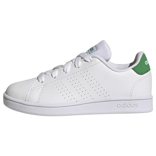 スニーカー キッズアドバンコート 男の子 女の子 対象サイズ17~22.5cm。カラー:フットウェイト/グリーン/コアブラック(GY6995)。サイズ:18.0cm。快適な履き心地とスタイリッシュなデザインが特徴。