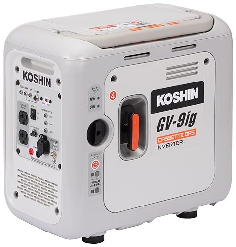 工進(KOSHIN)のカセットガスインバーター発電機GV-9igは、0.9kVAの定格出力を持ち、静音設計でアウトドアや防災に最適。USB出力、並列運転が可能で、寒冷地にも対応。