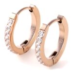PLUSTERのフープピアスは、シンプルなデザインでキュービックジルコニアを使用。ステンレス製で金属アレルギーに対応し、ピンクゴールド仕上げ。男女共に使用可能で、ポーチ付きで誕生日やプレゼントに最適です。