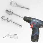 電動ドリル用のハンドミキサーアタッチメントセット。ステンレス製で食洗機対応。ビーター、生地フック、バルーン泡立て器の3種を含む。長さ7.5インチ、効率的な混ぜ作業を実現。