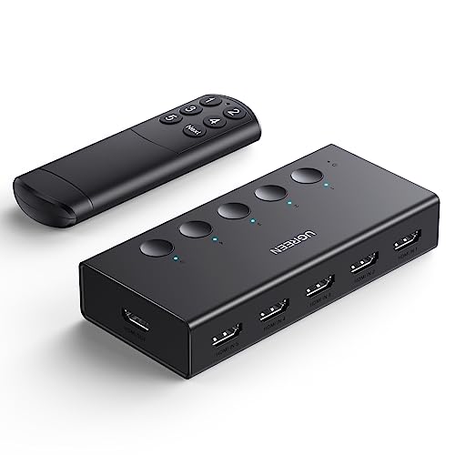 UGREEN HDMI切り替え器は、5入力1出力の手動スイッチャーで、4K@60Hz対応。HDCP 2.2/HDMI 2.0に準拠し、PS3、PS4、PS5、Switchで動作確認済み。全体はブラック仕様です。